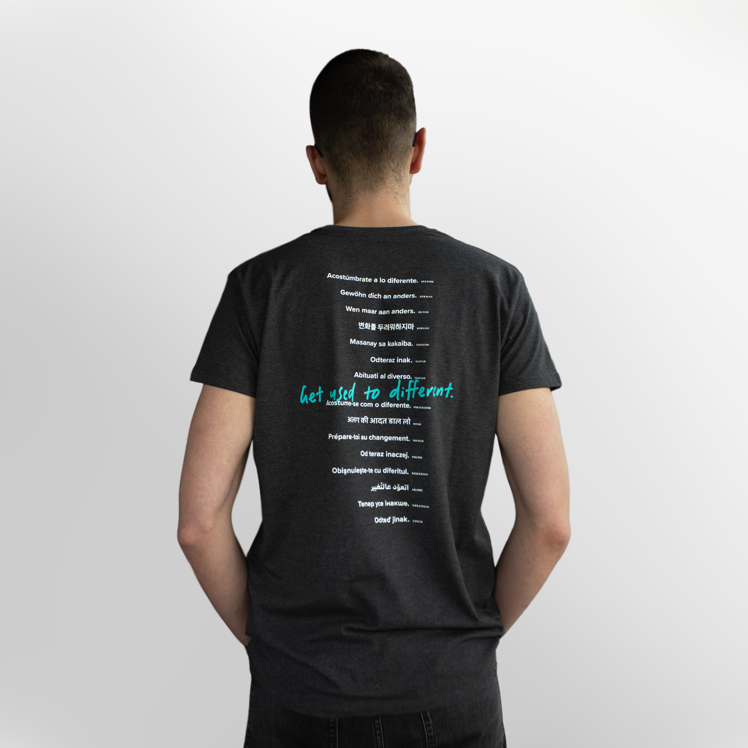 Na plecach hasło „przyzwyczaj się do tego, co inne” w 16 językach.